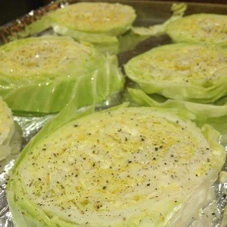 2. Wash and remove outer leaves. Trim Stem off, cut 1 to 1 1/2 inch steaks, and brush both sides with olive oil. Add garlic salt and pepper to both sides. Bake 30 to 40 minutes.