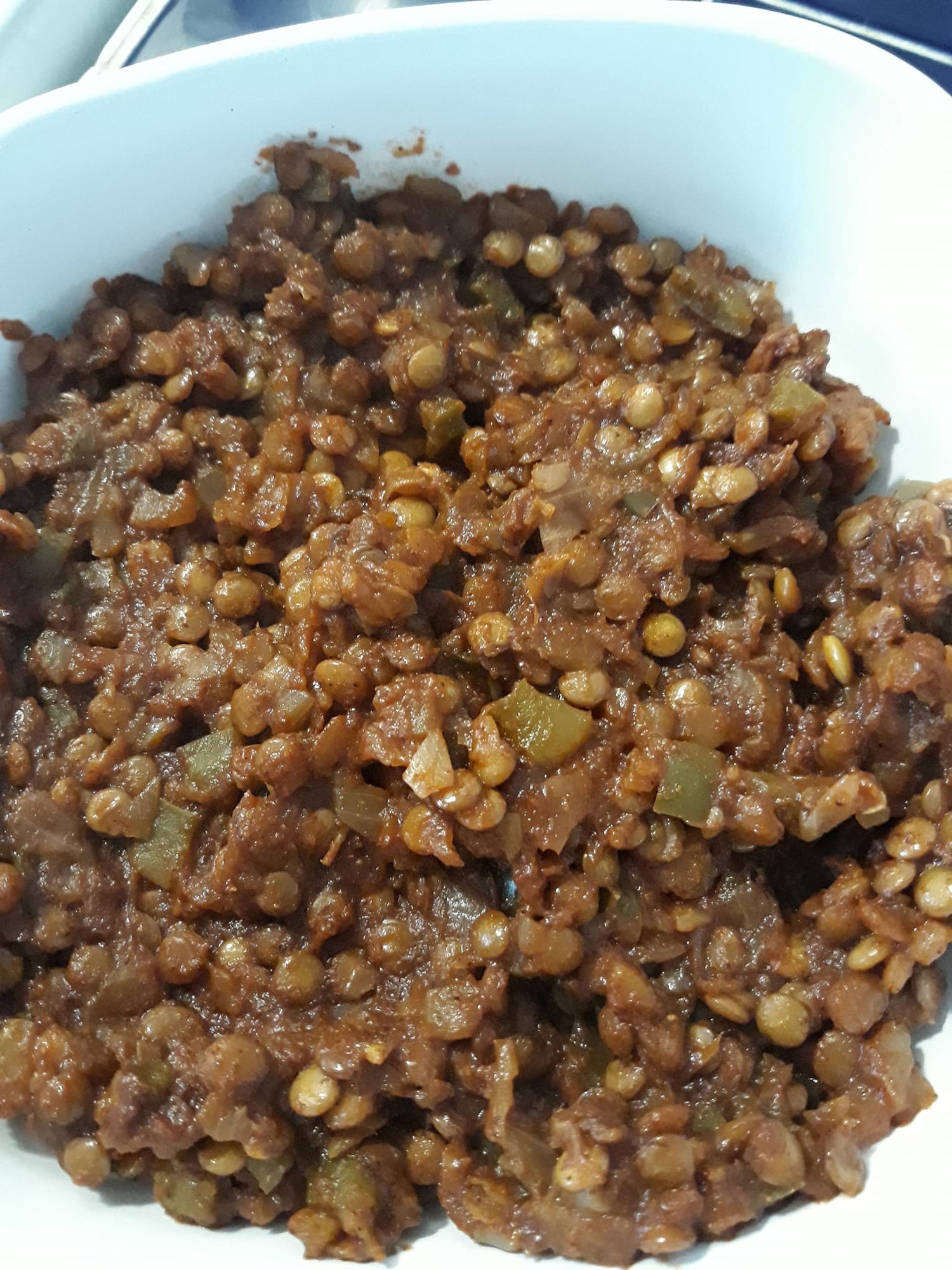 1. Heat oil in medium saucepan over medium-high heat. Add onion and bell pepper; cook and stir 5 minutes or until onion is softened. Add sugar, chili powder, salt, garlic powder and onion powder; cook and stir 30 seconds. Stir in tomato sauce, lentils and broth; bring to a boil.