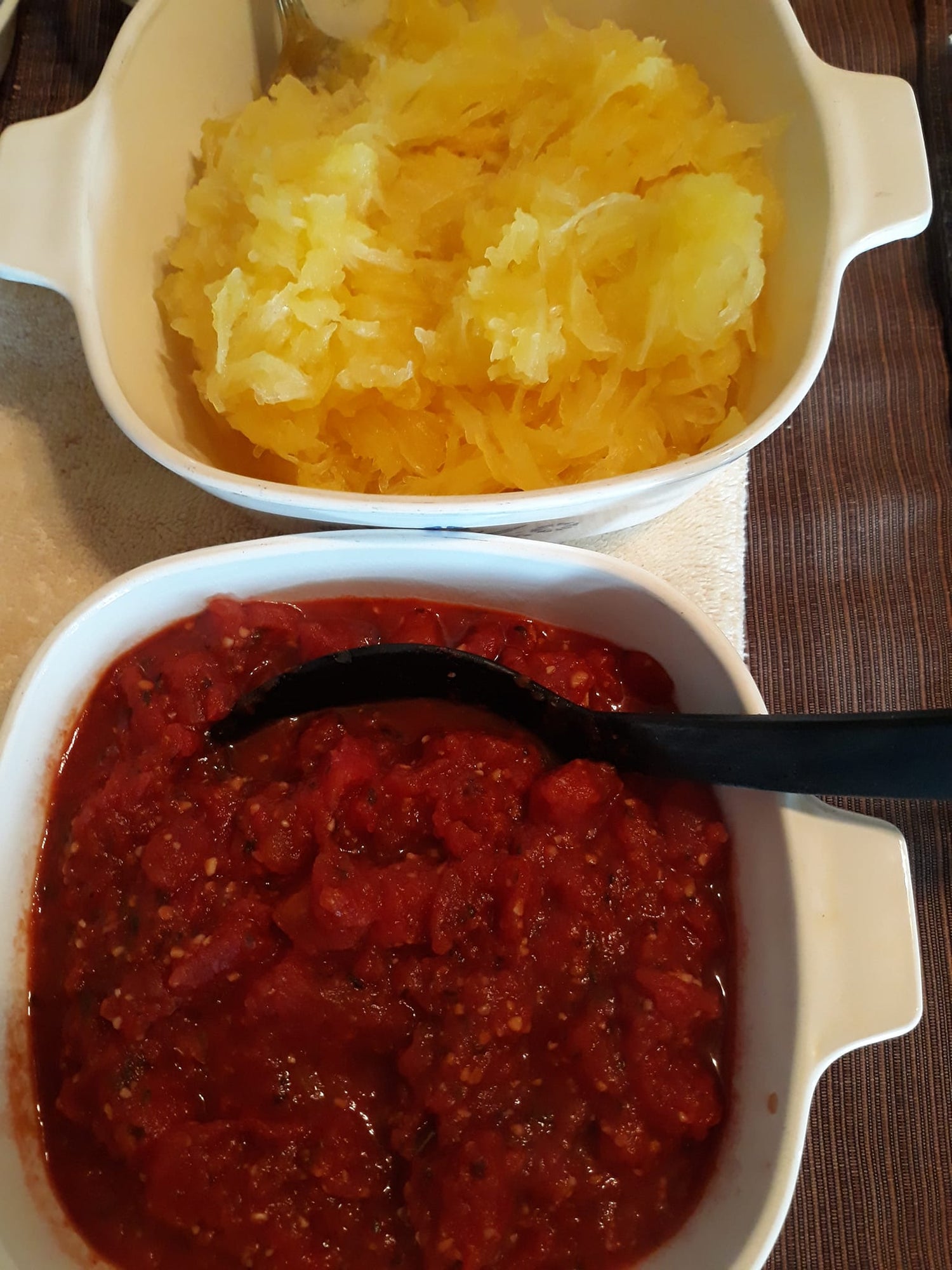 3. When the squash is done baking, remove and discard its seeds. Use a fork to scrape the squash in strands and place in a large bowl. Add the sauce and toss gently to combine and serve.
