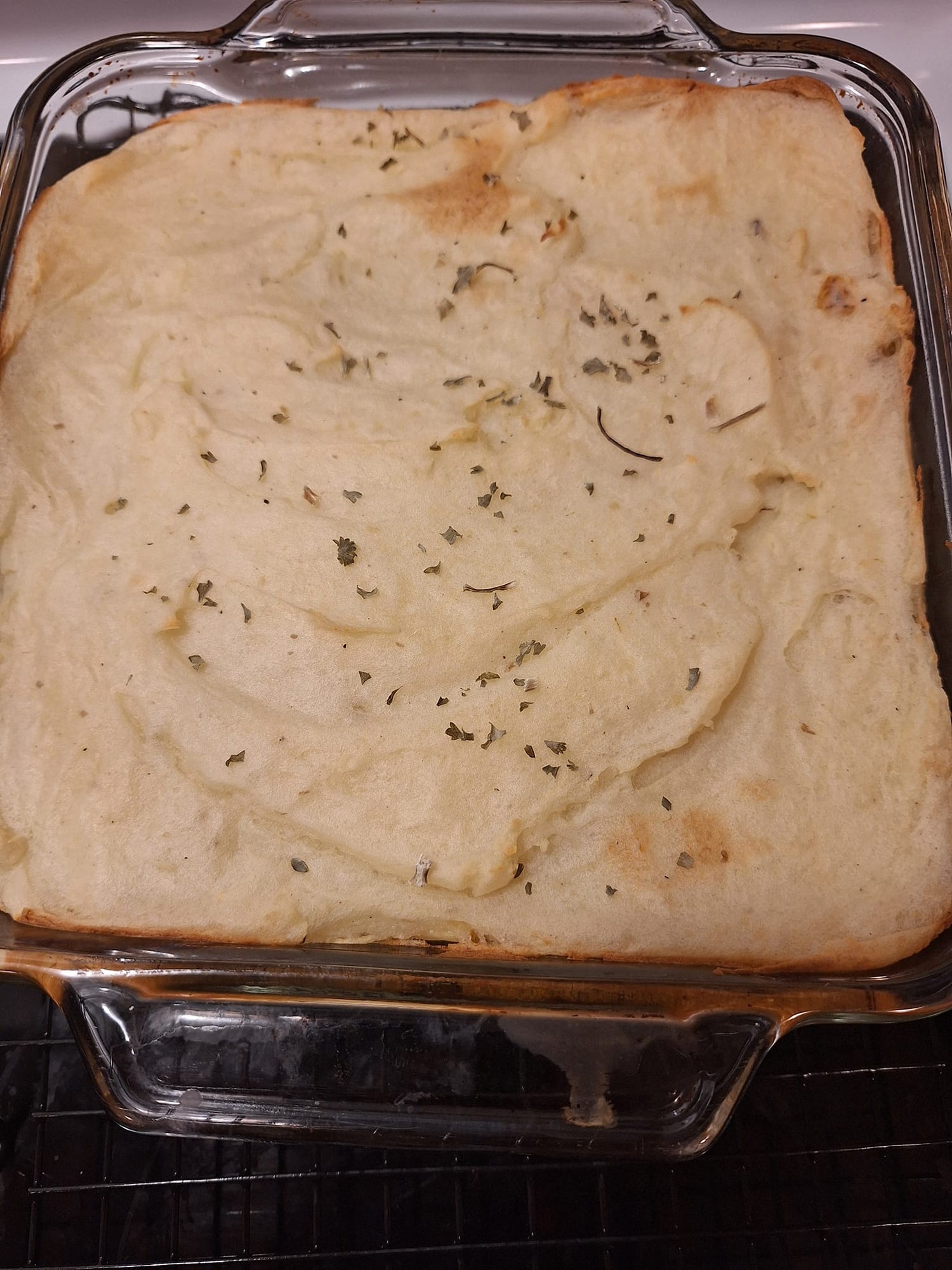 3. Use a 9x9 or 9x11 baking dish and put vegetables in it. Then spread an even layer of mashed potatoes. Bake uncovered for 25 to 30 minutes. Let cool for 15 minutes before serving. Garnish with Parsley.