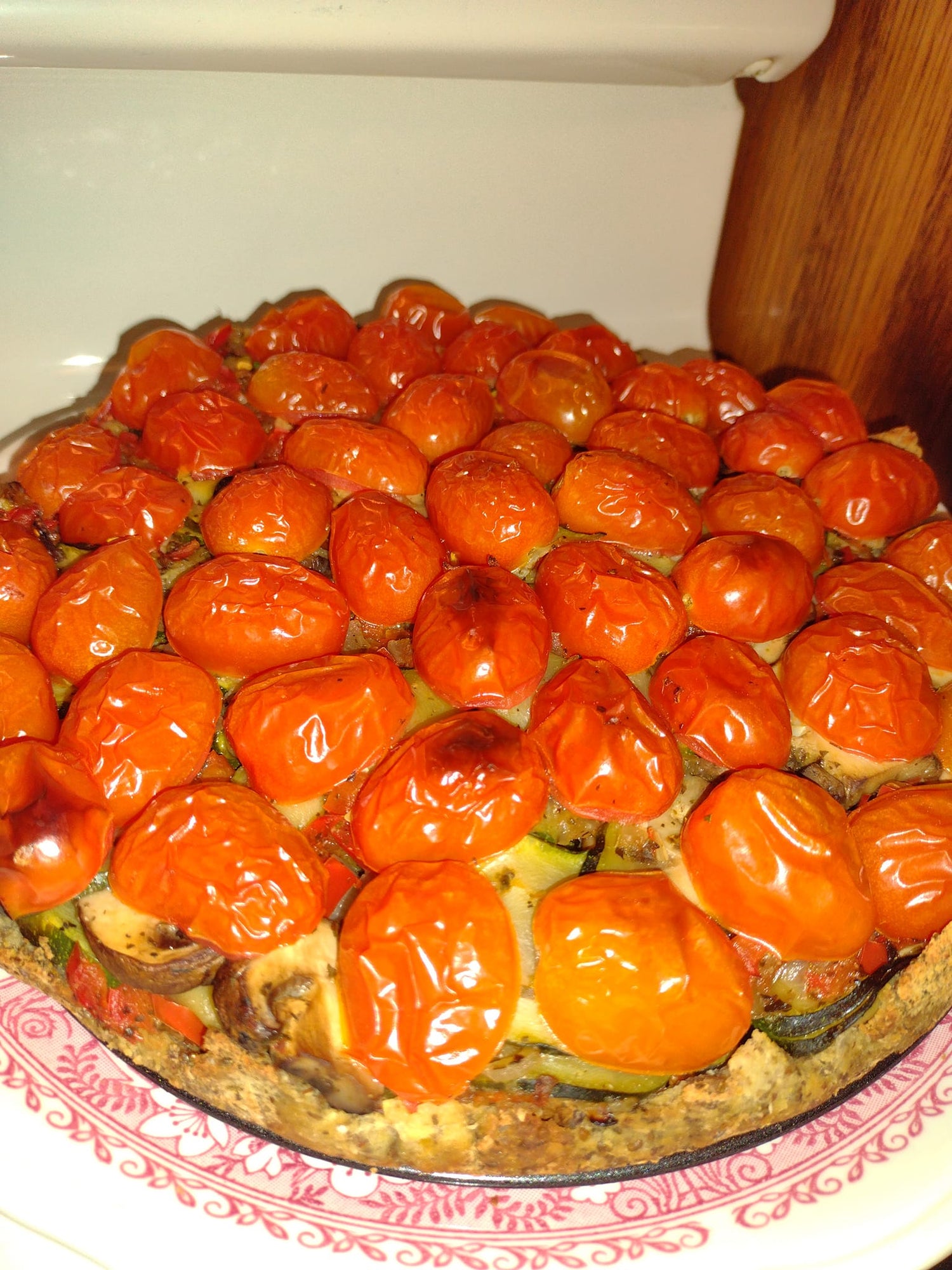 Spread the white bean mixture evenly over the chickpea crust, and then spread the vegetables evenly over the white bean mixture. Arrange the tomato halves, cut side down, on top of the vegetables ina concentric pattern around the edge, gently pressing the tomatoes into the vegetables. Sprinkle the top with ground walnuts (if using). Bake until hot and nicely set, 18 to 20 minutes.