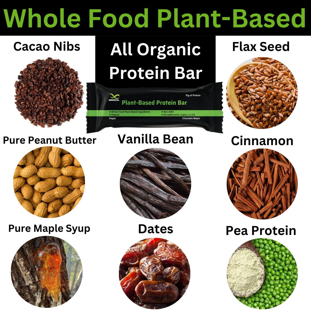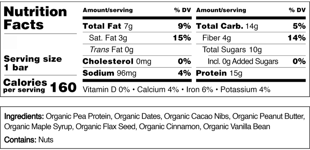 Organic Pea Protein, Organic Dates, Organic Cacao Nibs, Organic Peanut Butter, Organic Maple Syrup, Organic Flax Seed, Organic Cinnamon, and Organic Vanilla Bean.